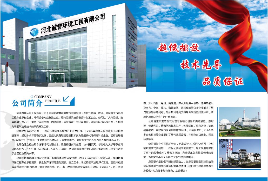 河北誠譽環(huán)境工程有限公司(原河北誠譽噴霧技術(shù)有限公司)是一家專業(yè)從事煙氣脫硫脫硝的高科技環(huán)保企業(yè)。公司擁有近二十年霧化經(jīng)驗,主要業(yè)務(wù)領(lǐng)域包括:SCR、SNCR脫硫脫硝系統(tǒng)設(shè)計、脫硝工程承包,各種規(guī)格型號脫硫脫硝噴槍噴嘴、霧化噴嘴噴槍的研發(fā)、生產(chǎn)及銷售。產(chǎn)品廣泛應(yīng)用于電力、水泥、化工、食品、制藥等行業(yè)。